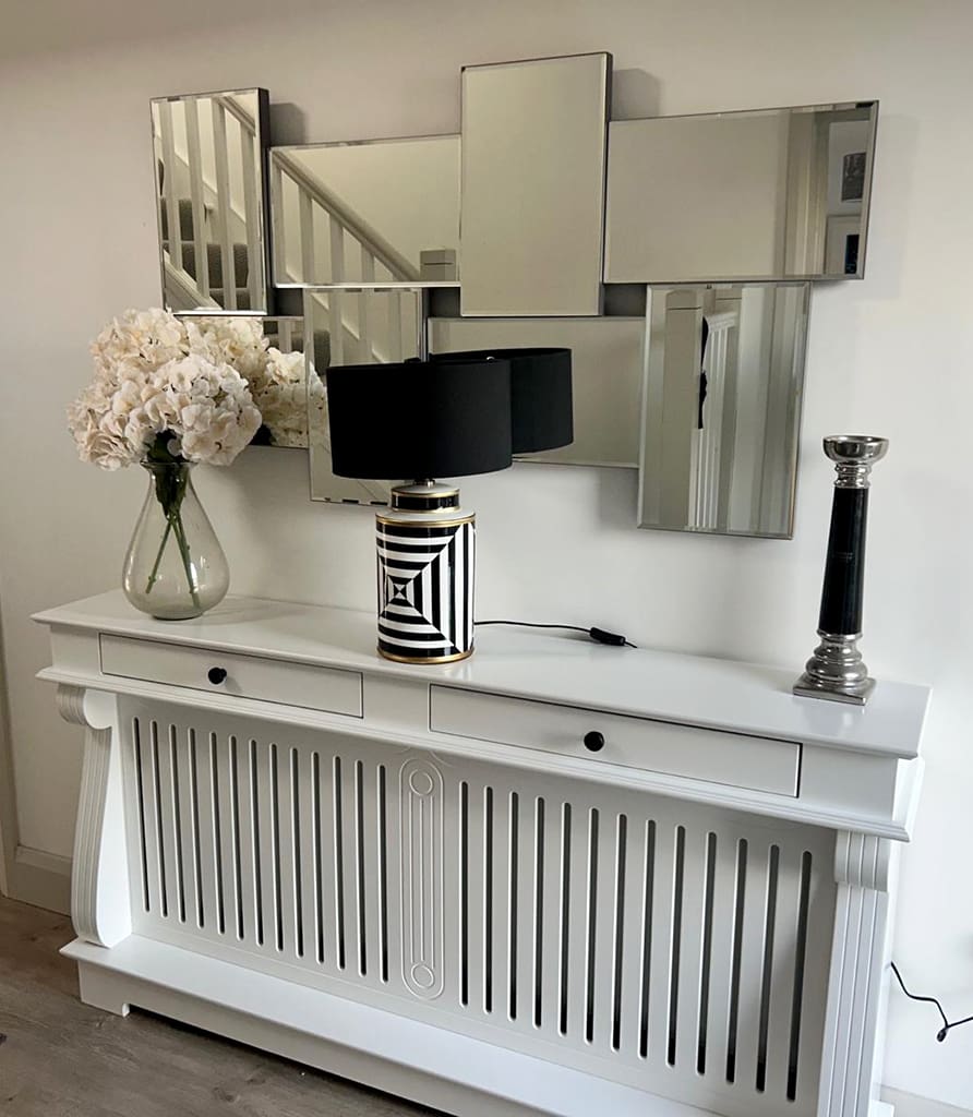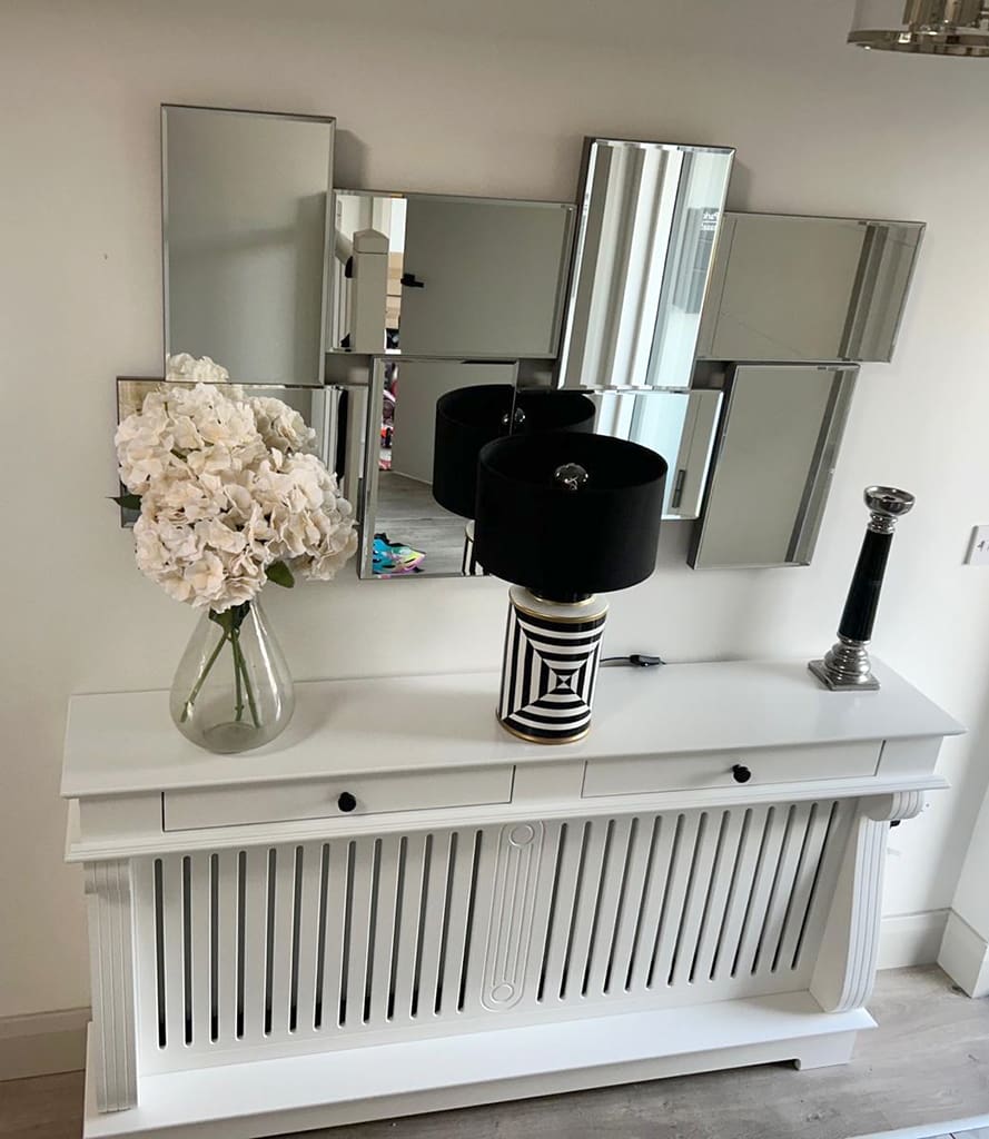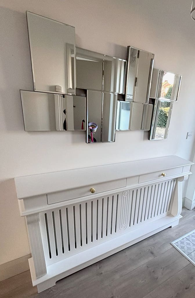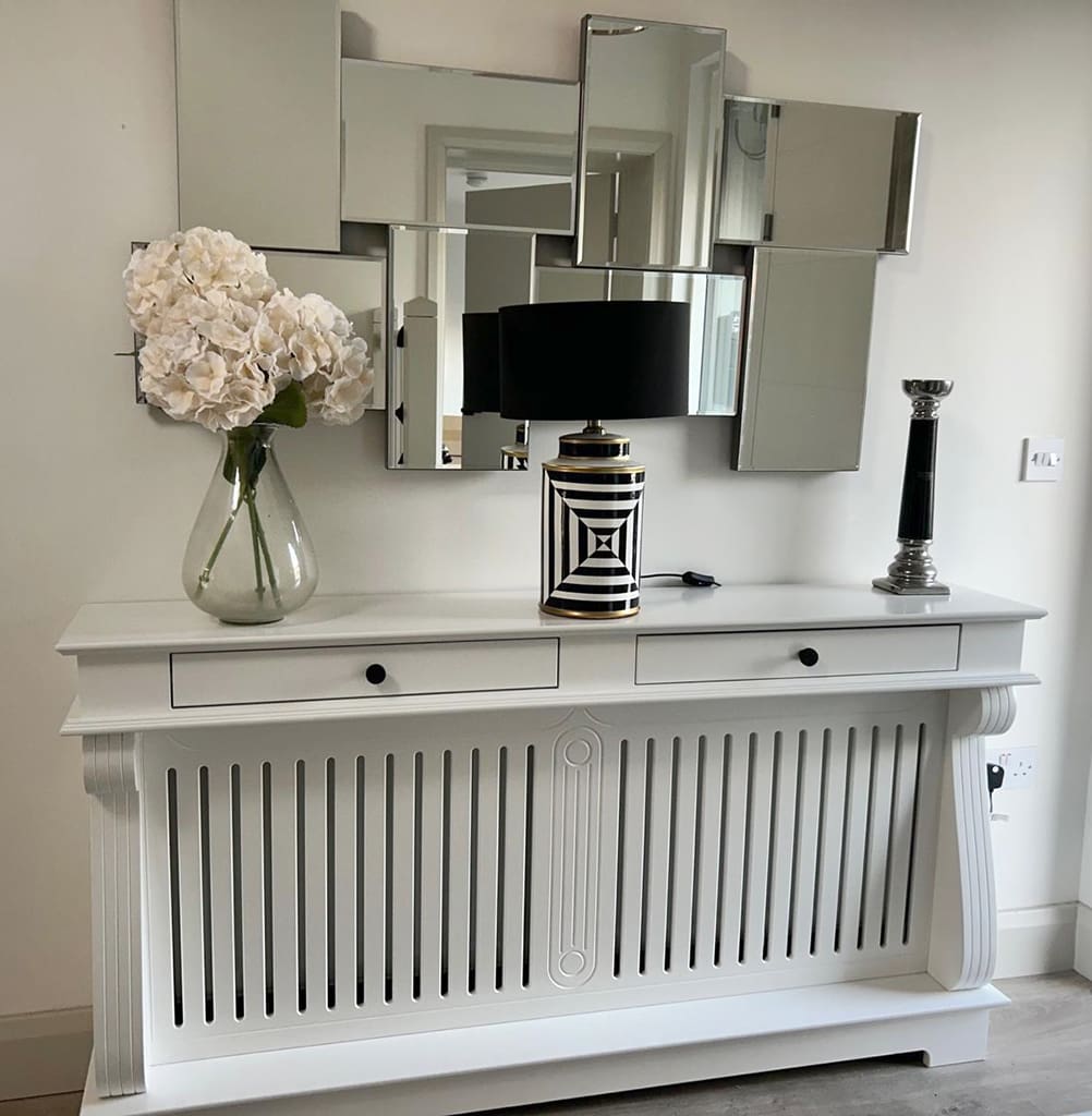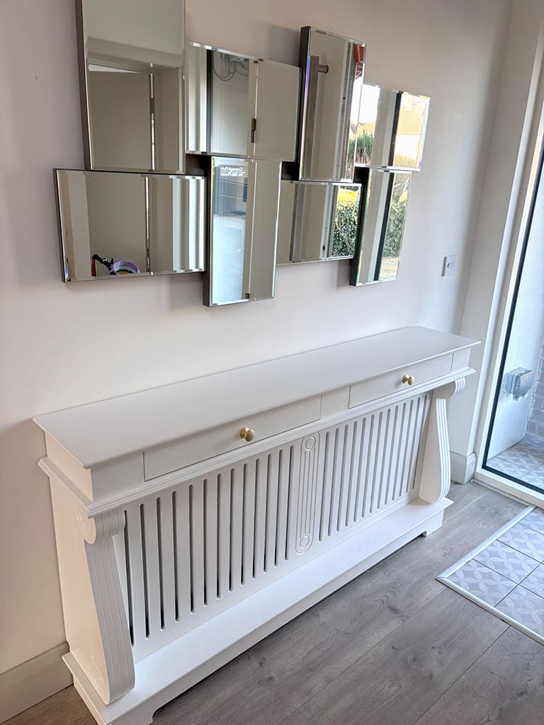 This is not a Rad Cover, this is an Irish Woodcraft Radiator Console Table, a beautifully a crafted piece of furniture, designed to elegantly cover and complement your radiator. Made from high-quality wood and materials, depending on the look you are after, it features a sleek, minimalist design that effortlessly blends with both modern and traditional interiors. The table offers a practical surface for displaying decorative items like vases, picture frames, or lamps, while the slatted front panel allows heat to circulate efficiently. Make those unsightly radiators the focal point of any room or hallway.